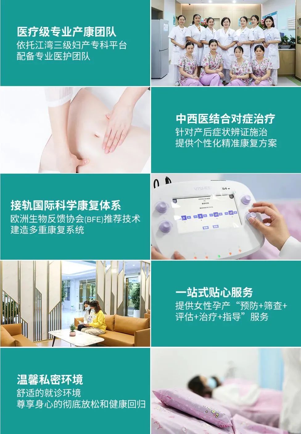 长沙江湾妇产医院为您带来医疗级产康服务,呵护女性生殖健康全周期!江湾产后康复中心每一位治疗师都经过了严格又专业的培训,针对每位产后妈妈个性化需求,制定体检、评估、疗程安排、动态监测等完整的一站式康复流程,运用中西医结合、肌肉训练、生物反馈、物理治疗等多种手段,有效加快产后恢复。现推出系列产后康复套餐,多种选择,事半功倍,帮助女性远离产后问题困扰,重回孕前好状态!